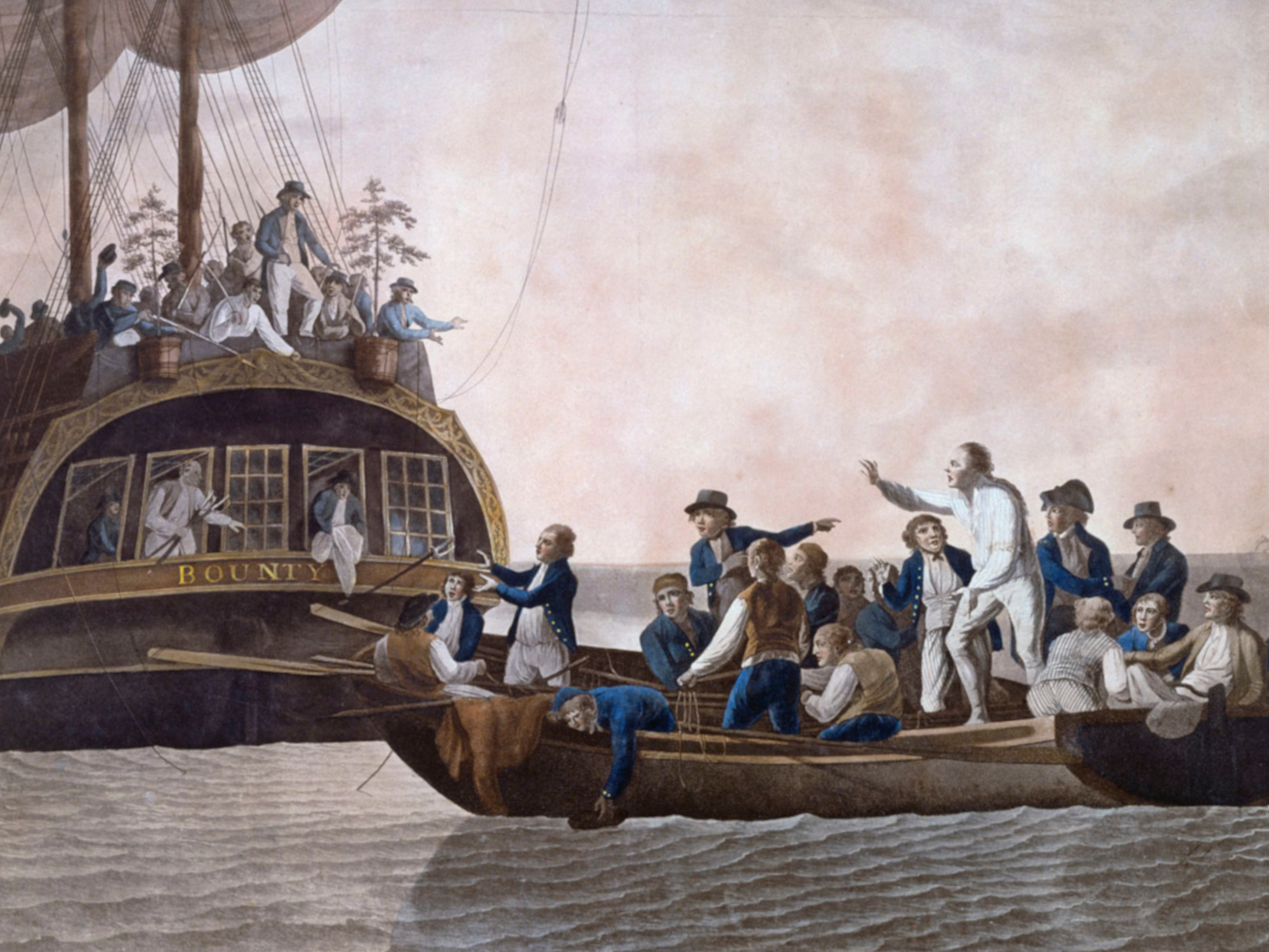 Image: Dodd, Robert. The Mutineers turning Lt Bligh and part of the Officers and Crew adrift from His Majesty’s Ship the Bounty, 29th April 1789. 2nd October, 1790. Hand-coloured aquatint. National Maritime Museum, Greenwich, London. Via Wikimedia.