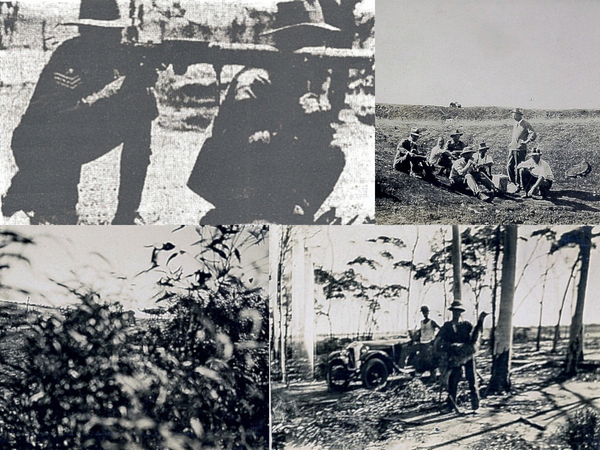 Images: Evans, Lee. (Clockwise from top left) Sergeant S. McMurray & Gunner J. O’Halloran Armed with Lewis Machine Gun, Lying in Wait with Lewis Machine Gun Covered on Bank, Ray Owen with Emu, Emus Coming in for Water. Photograph. November 1932. Via Pickering Brook Heritage Group.