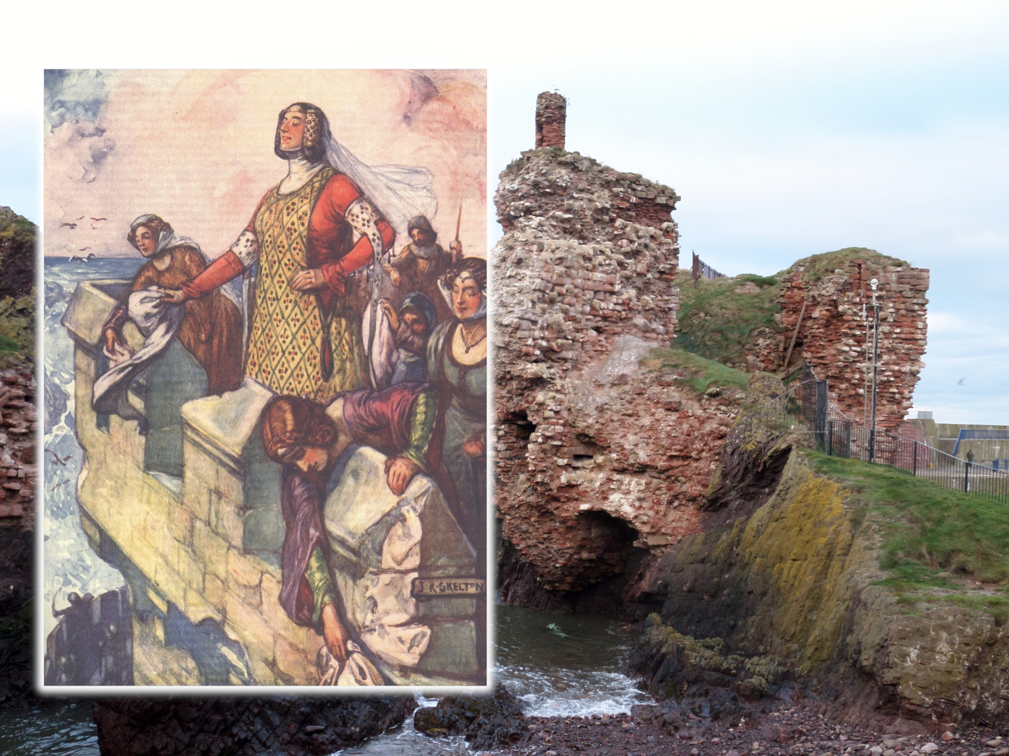 Images: (main) Rosser1954. Dunbar Castle, East Lothian. 3rd November, 2017. Photograph. Via Wikimedia. (Inset) Skelton, J.R.. Black Agnes. 1906. In Scotland’s Story. London: T.C. & E.C. Jack, 1906. Via Wikimedia.